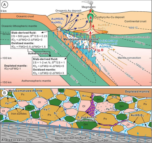 团队利用热力学模型揭示了黄金在从地幔上升到地表的岩浆中富集的具体条件。黄金在地幔中(特别是位于俯冲带上方区域)是相当稳定的。然而,当来自俯冲板块的含有三硫化物离子的流体,在特定条件下被注入到地幔中时,黄金就会与三硫化物结合,形成金-三硫化物络合物。这种络合物在岩浆中具有极高的流动性,使得黄金得以从地幔中被“提取”出来,并最终随着岩浆一起上升到地表。
